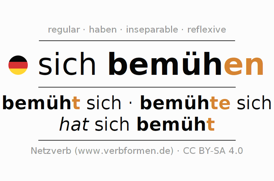 Clear online presentation of the verb 'sich bemühen' including all verb forms. Therfore, the flection of the verb sich bemühen can be useful for homework, tests, exams, German lessons in school, learning German, during studies and adult education. Especially for people learning German it is essential to know the correct flection of a verb (bemüht sich - bemühte sich - hat sich bemüht).