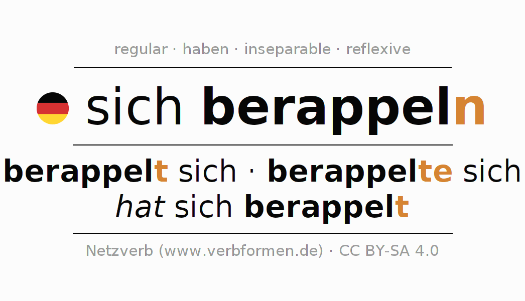 - Perfect: ich habe mir/mich berappelt, du hast dir/dich berappelt, er hat sich berappelt, wir haben uns berappelt, ihr habt euch berappelt, sie haben sich berappelt