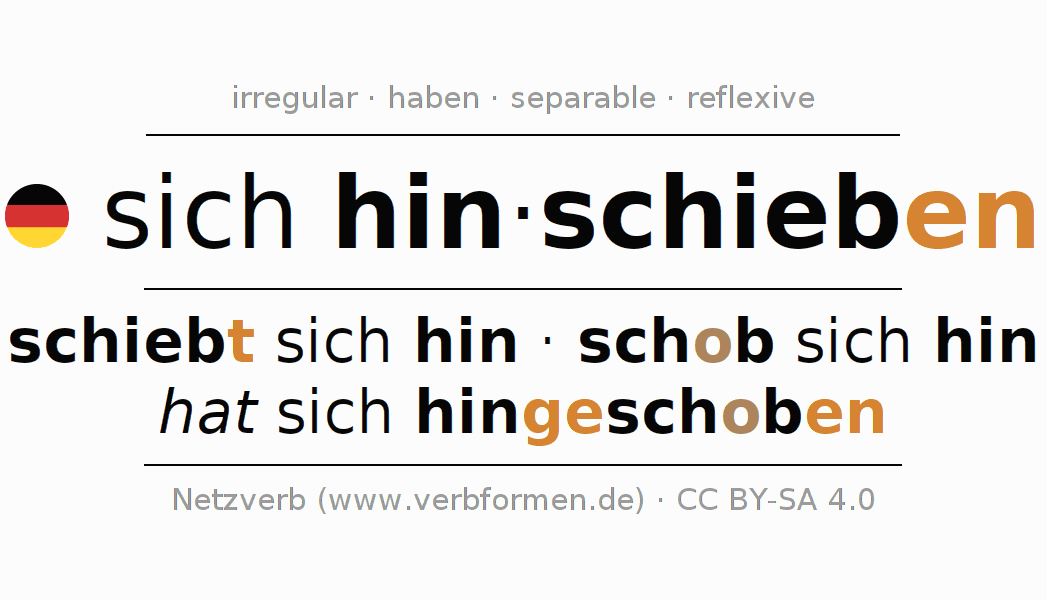 - Perfect: ich habe mir/mich hingeschoben, du hast dir/dich hingeschoben, er hat sich hingeschoben, wir haben uns hingeschoben, ihr habt euch hingeschoben, sie haben sich hingeschoben