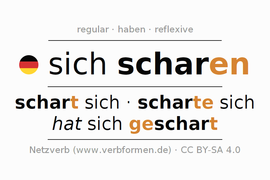 - Present: schar(e) (du) dir/dich, scharen wir uns, schart (ihr) euch, scharen Sie sich