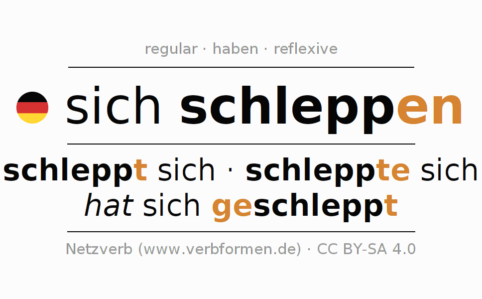 - Present: ich schlepp(e) mir/mich, du schleppst dir/dich, er schleppt sich, wir schleppen uns, ihr schleppt euch, sie schleppen sich