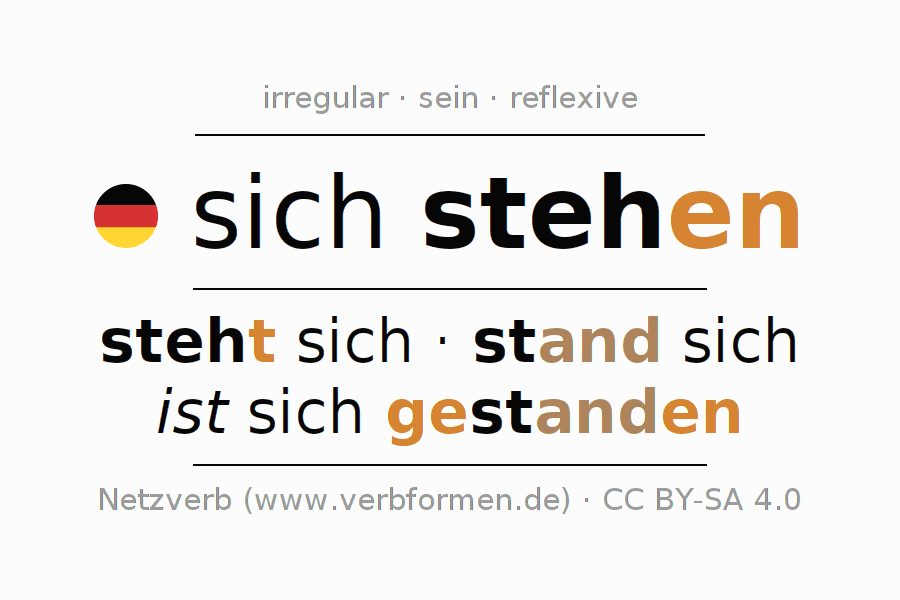 Clear online presentation of the verb 'sich stehen' including all verb forms. Therfore, the flection of the verb sich stehen can be useful for homework, tests, exams, German lessons in school, learning German, during studies and adult education. Especially for people learning German it is essential to know the correct flection of a verb (steht sich - stand sich - ist sich gestanden).