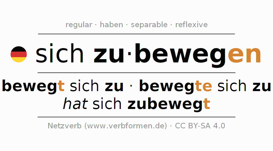 - Present: beweg(e) (du) dir/dich zu, bewegen wir uns zu, bewegt (ihr) euch zu, bewegen Sie sich zu