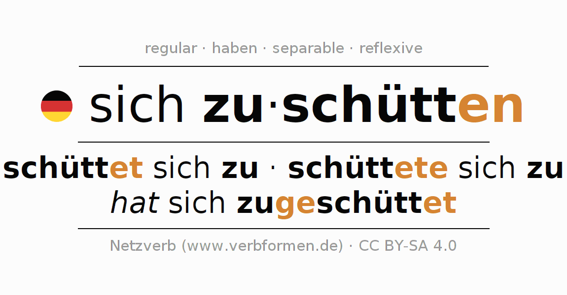 - Perfect: ich habe mir/mich zugeschüttet, du habest dir/dich zugeschüttet, er habe sich zugeschüttet, wir haben uns zugeschüttet, ihr habet euch zugeschüttet, sie haben sich zugeschüttet