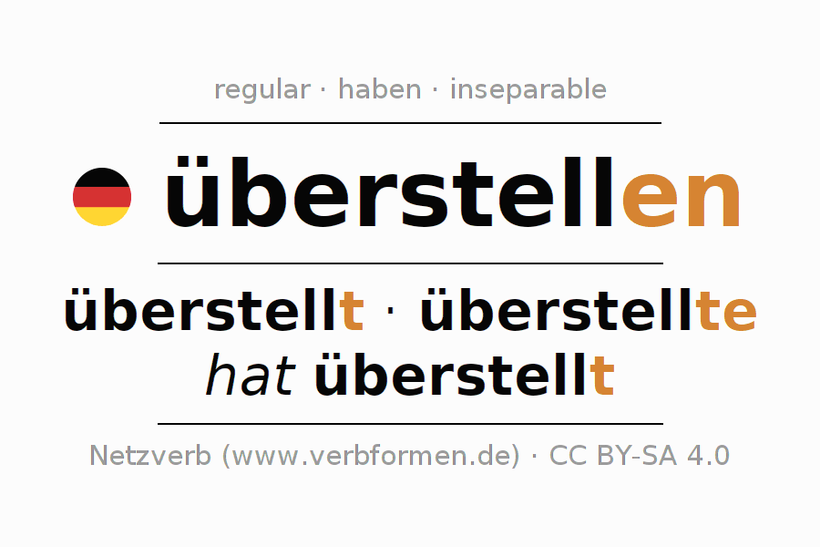 - Future: ich werde überstellen, du werdest überstellen, er werde überstellen, wir werden überstellen, ihr werdet überstellen, sie werden überstellen