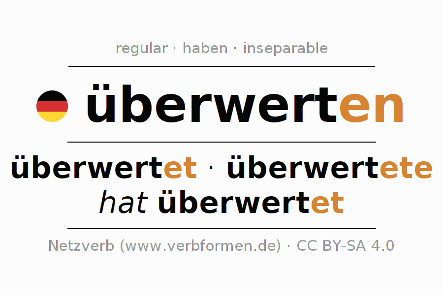- Perfect: ich habe überwertet, du hast überwertet, er hat überwertet, wir haben überwertet, ihr habt überwertet, sie haben überwertet