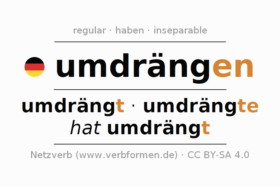 Clear online presentation of the verb 'umdrängen' including all verb forms. Therfore, the flection of the verb umdrängen can be useful for homework, tests, exams, German lessons in school, learning German, during studies and adult education. Especially for people learning German it is essential to know the correct flection of a verb (umdrängt - umdrängte - hat umdrängt).
