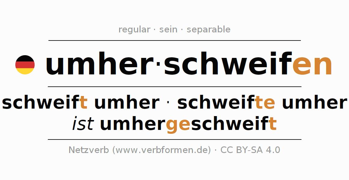 - Future: ich werde umherschweifen, du wirst umherschweifen, er wird umherschweifen, wir werden umherschweifen, ihr werdet umherschweifen, sie werden umherschweifen