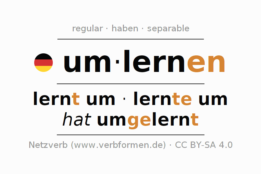- Present: lern(e) (du) um, lernen wir um, lernt (ihr) um, lernen Sie um