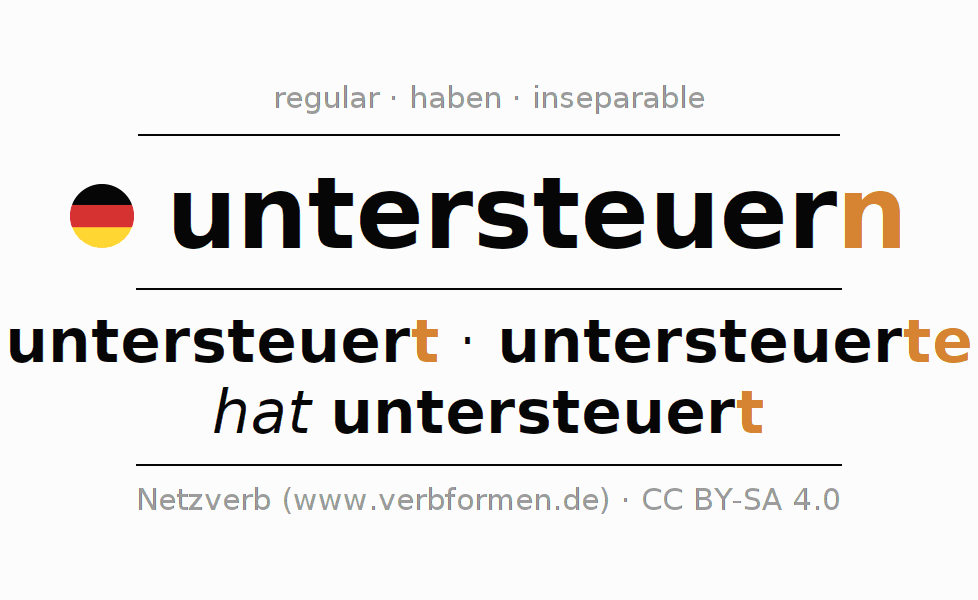 Clear online presentation of the verb 'untersteuern' including all verb forms. Therfore, the flection of the verb untersteuern can be useful for homework, tests, exams, German lessons in school, learning German, during studies and adult education. Especially for people learning German it is essential to know the correct flection of a verb (untersteuert - untersteuerte - hat untersteuert).
