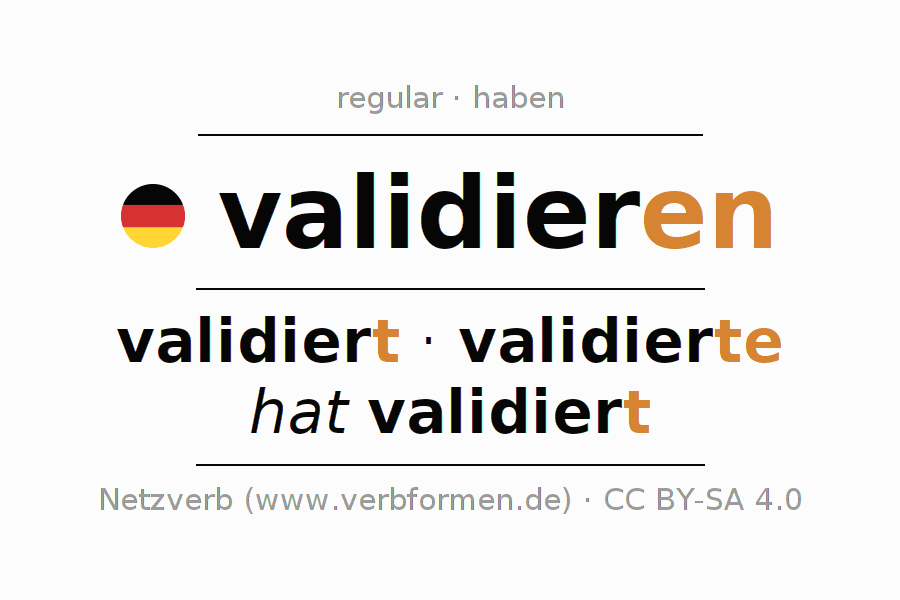 - Present: validier(e) (du), validieren wir, validiert (ihr), validieren Sie