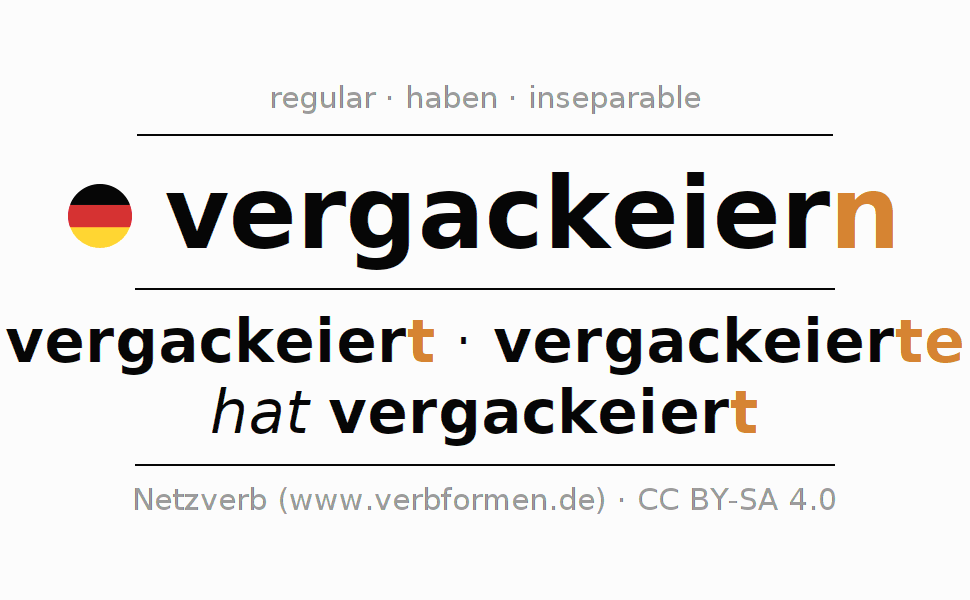 - Future: ich werde vergackeiern, du wirst vergackeiern, er wird vergackeiern, wir werden vergackeiern, ihr werdet vergackeiern, sie werden vergackeiern