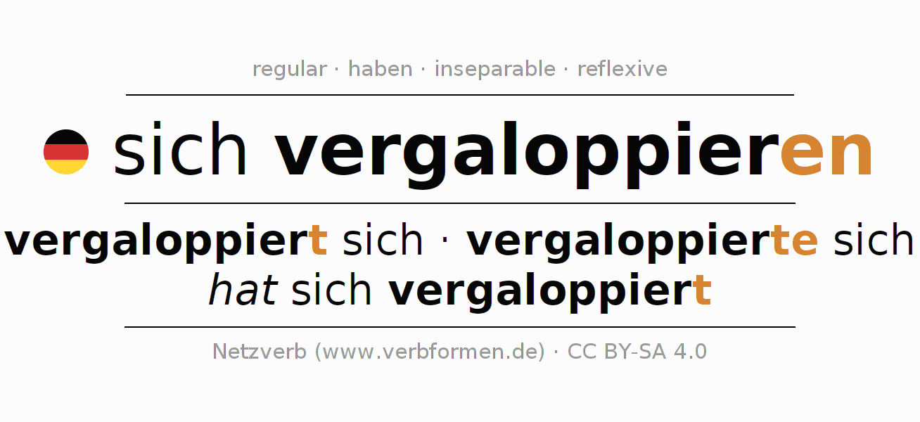 - Perfect: ich habe mir/mich vergaloppiert, du habest dir/dich vergaloppiert, er habe sich vergaloppiert, wir haben uns vergaloppiert, ihr habet euch vergaloppiert, sie haben sich vergaloppiert