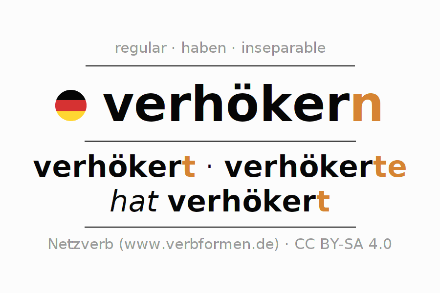 Clear online presentation of the verb 'verhökern' including all verb forms. Therfore, the flection of the verb verhökern can be useful for homework, tests, exams, German lessons in school, learning German, during studies and adult education. Especially for people learning German it is essential to know the correct flection of a verb (verhökert - verhökerte - hat verhökert).