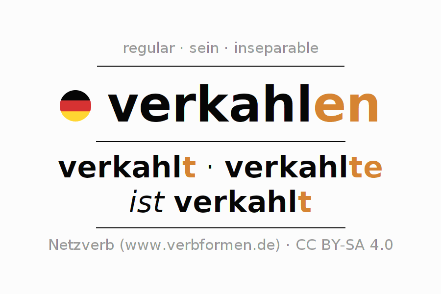 Clear online presentation of the verb 'verkahlen' including all verb forms. Therfore, the flection of the verb verkahlen can be useful for homework, tests, exams, German lessons in school, learning German, during studies and adult education. Especially for people learning German it is essential to know the correct flection of a verb (verkahlt - verkahlte - ist verkahlt).