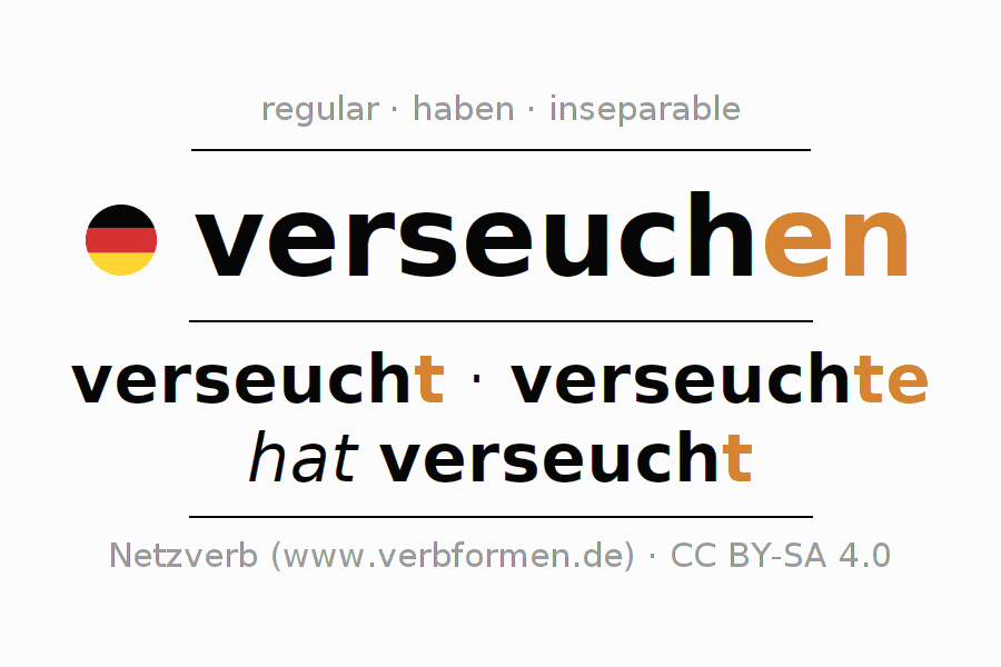 Clear online presentation of the verb 'verseuchen' including all verb forms. Therfore, the flection of the verb verseuchen can be useful for homework, tests, exams, German lessons in school, learning German, during studies and adult education. Especially for people learning German it is essential to know the correct flection of a verb (verseucht - verseuchte - hat verseucht).
