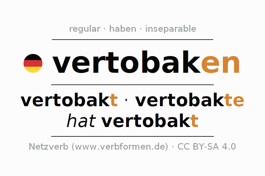 Clear online presentation of the verb 'vertobaken' including all verb forms. Therfore, the flection of the verb vertobaken can be useful for homework, tests, exams, German lessons in school, learning German, during studies and adult education. Especially for people learning German it is essential to know the correct flection of a verb (vertobakt - vertobakte - hat vertobakt).