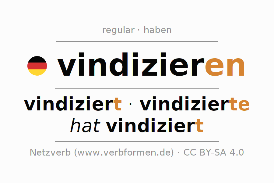 - Future: ich werde vindizieren, du wirst vindizieren, er wird vindizieren, wir werden vindizieren, ihr werdet vindizieren, sie werden vindizieren