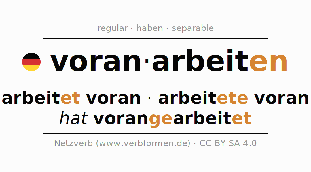 - Present: ich arbeite voran, du arbeitest voran, er arbeite voran, wir arbeiten voran, ihr arbeitet voran, sie arbeiten voran