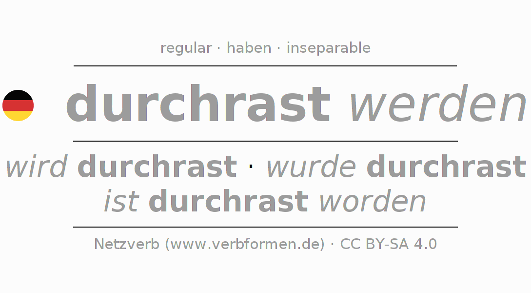 Clear online presentation of the verb 'durchrast werden' including all verb forms. Therfore, the flection of the verb durchrast werden can be useful for homework, tests, exams, German lessons in school, learning German, during studies and adult education. Especially for people learning German it is essential to know the correct flection of a verb (wird durchrast - wurde durchrast - ist durchrast worden).