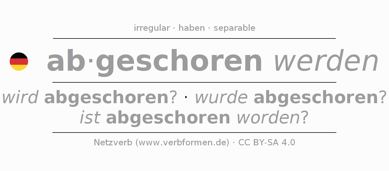 The conjugation of the verb abscheren (cut off, shear) is irregular. Basic forms are wird abgeschoren?, wurde abgeschoren? and ist abgeschoren worden?. The stem vowels are e - o - o. The auxiliary verb of abscheren is haben. First syllable ab- of abscheren is separable. The flection is in Passive and the use as Interrogative. For a better understanding, countless examples of the verb abscheren are available. For practicing and consolidating, there are also free worksheets for abscheren. You can not just abscheren conjugate, but all German verbs. Comments ☆