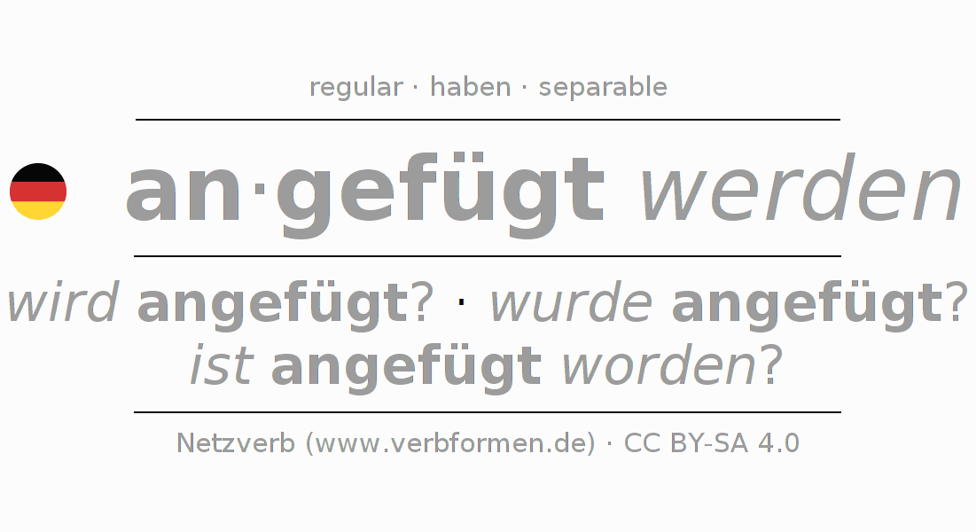 Clear online presentation of the verb 'an·gefügt werden' including all verb forms. Therfore, the flection of the verb an·gefügt werden can be useful for homework, tests, exams, German lessons in school, learning German, during studies and adult education. Especially for people learning German it is essential to know the correct flection of a verb (wird angefügt? - wurde angefügt? - ist angefügt worden?).
