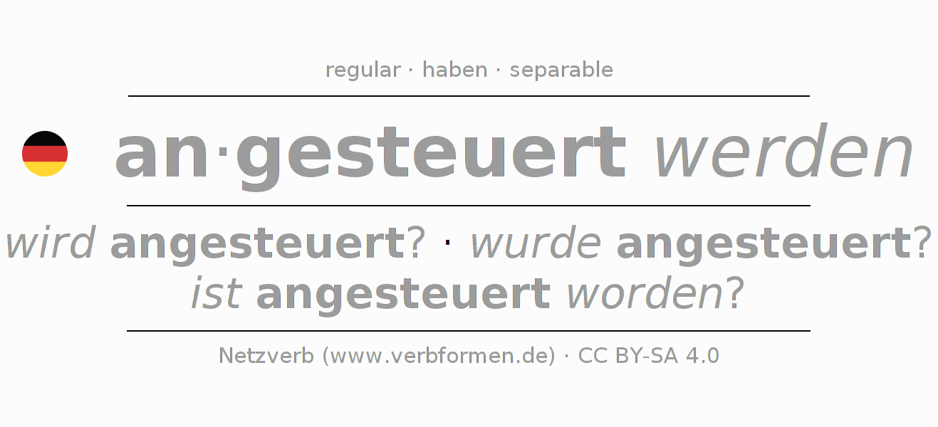 - Future Perfect: werde ich angesteuert worden sein?, wirst du angesteuert worden sein?, wird er angesteuert worden sein?, werden wir angesteuert worden sein?, werdet ihr angesteuert worden sein?, werden sie angesteuert worden sein?