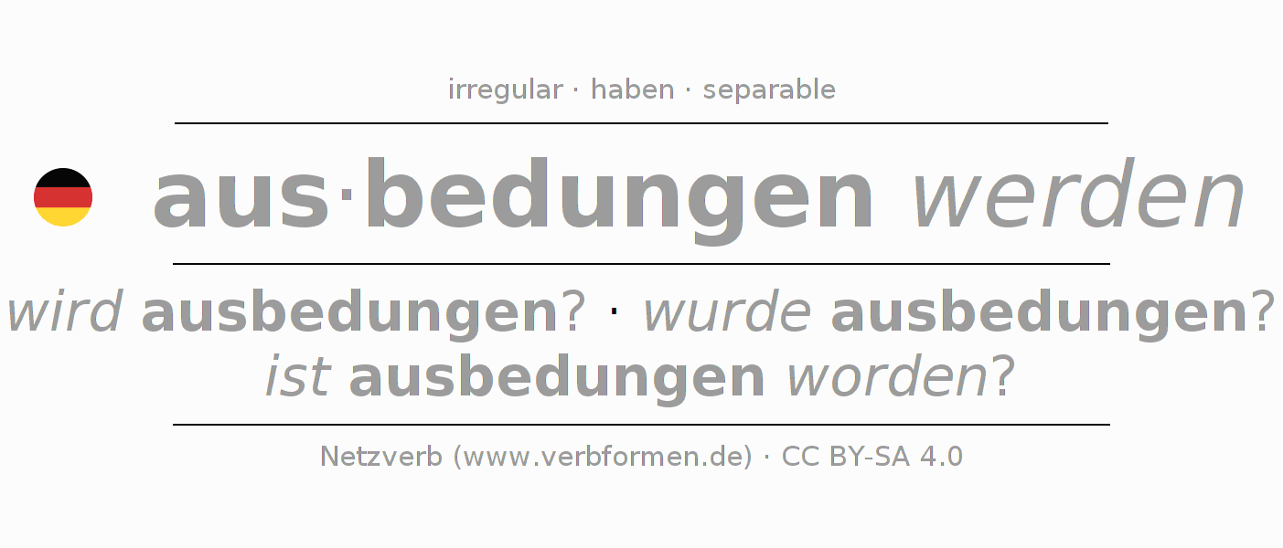 - Future: werde ich ausbedungen werden?, wirst du ausbedungen werden?, wird er ausbedungen werden?, werden wir ausbedungen werden?, werdet ihr ausbedungen werden?, werden sie ausbedungen werden?