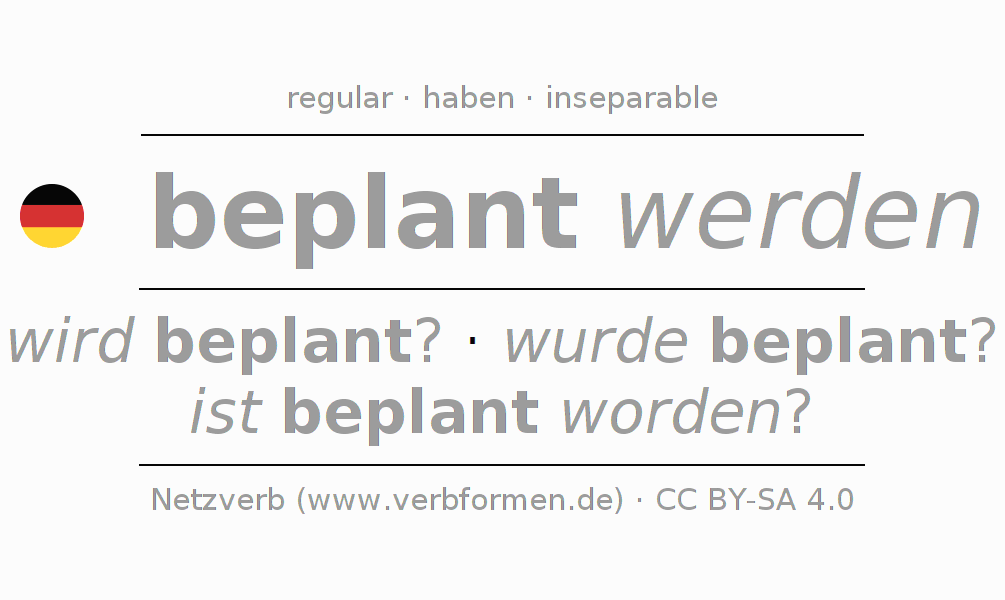 Clear online presentation of the verb 'beplant werden' including all verb forms. Therfore, the flection of the verb beplant werden can be useful for homework, tests, exams, German lessons in school, learning German, during studies and adult education. Especially for people learning German it is essential to know the correct flection of a verb (wird beplant? - wurde beplant? - ist beplant worden?).