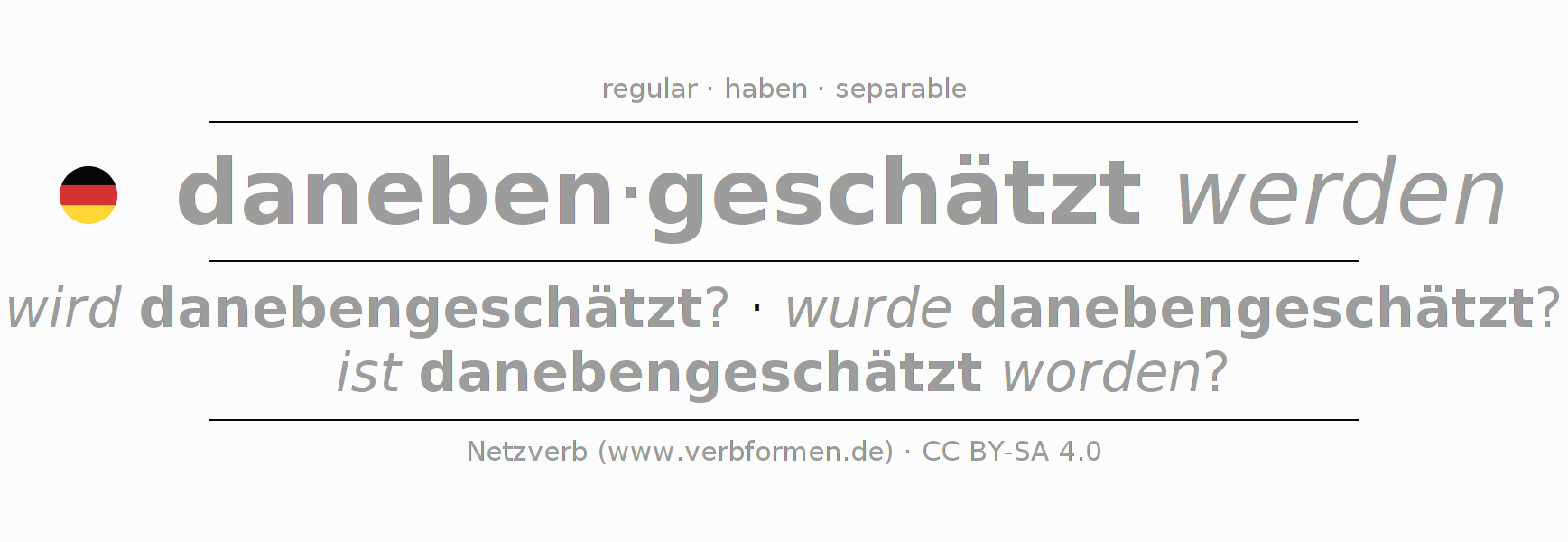 - Future: werde ich danebengeschätzt werden?, werdest du danebengeschätzt werden?, werde er danebengeschätzt werden?, werden wir danebengeschätzt werden?, werdet ihr danebengeschätzt werden?, werden sie danebengeschätzt werden?