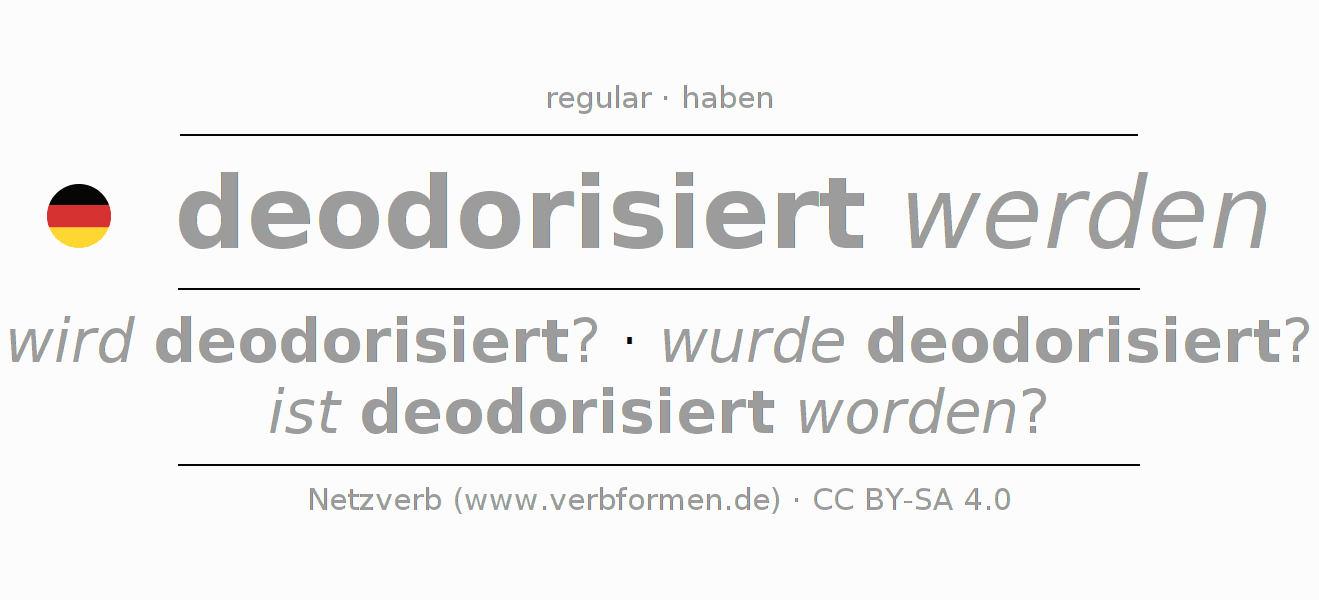 - Pluperfect: würde ich deodorisiert worden sein?, würdest du deodorisiert worden sein?, würde er deodorisiert worden sein?, würden wir deodorisiert worden sein?, würdet ihr deodorisiert worden sein?, würden sie deodorisiert worden sein?