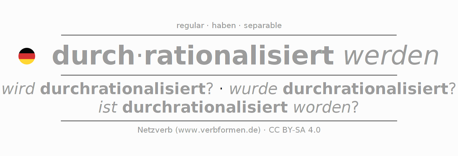 - Future: werde ich durchrationalisiert werden?, werdest du durchrationalisiert werden?, werde er durchrationalisiert werden?, werden wir durchrationalisiert werden?, werdet ihr durchrationalisiert werden?, werden sie durchrationalisiert werden?
