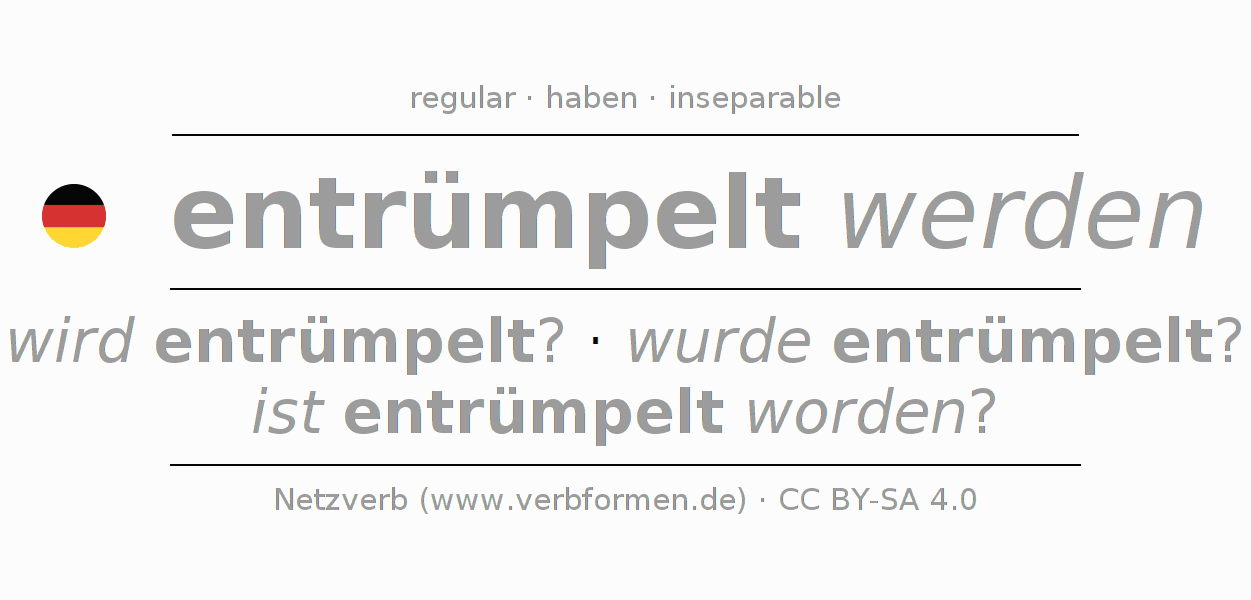 - Future Perfect: werde ich entrümpelt worden sein?, wirst du entrümpelt worden sein?, wird er entrümpelt worden sein?, werden wir entrümpelt worden sein?, werdet ihr entrümpelt worden sein?, werden sie entrümpelt worden sein?