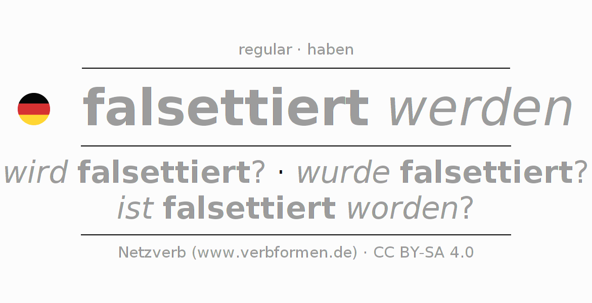 - Future: werde ich falsettiert werden?, werdest du falsettiert werden?, werde er falsettiert werden?, werden wir falsettiert werden?, werdet ihr falsettiert werden?, werden sie falsettiert werden?