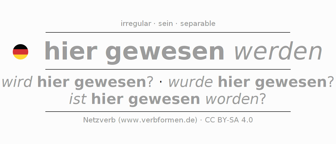- Future: werde ich hier gewesen werden?, werdest du hier gewesen werden?, werde er hier gewesen werden?, werden wir hier gewesen werden?, werdet ihr hier gewesen werden?, werden sie hier gewesen werden?