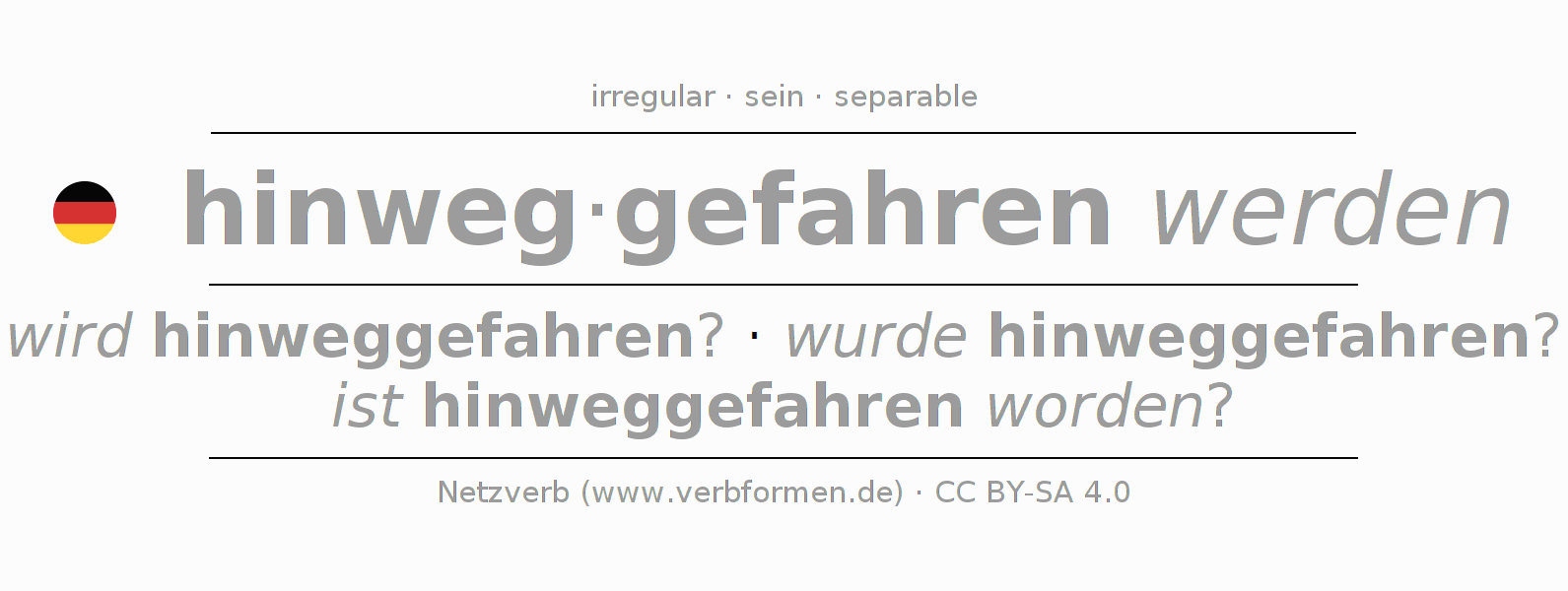 - Future Perfect: werde ich hinweggefahren worden sein?, wirst du hinweggefahren worden sein?, wird er hinweggefahren worden sein?, werden wir hinweggefahren worden sein?, werdet ihr hinweggefahren worden sein?, werden sie hinweggefahren worden sein?