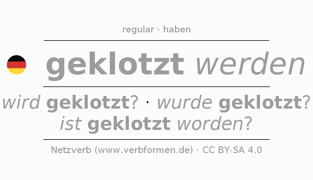 - Future: werde ich geklotzt werden?, wirst du geklotzt werden?, wird er geklotzt werden?, werden wir geklotzt werden?, werdet ihr geklotzt werden?, werden sie geklotzt werden?