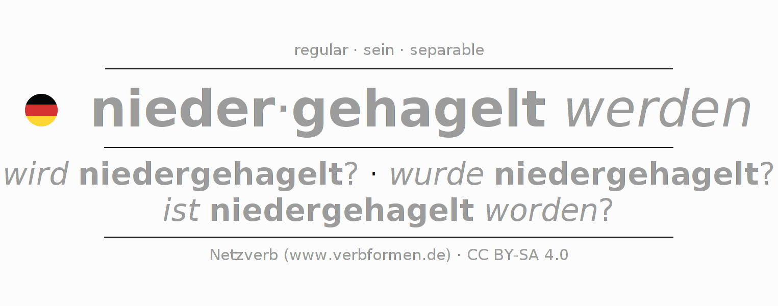 - Future Perfect: werde ich niedergehagelt worden sein?, wirst du niedergehagelt worden sein?, wird er niedergehagelt worden sein?, werden wir niedergehagelt worden sein?, werdet ihr niedergehagelt worden sein?, werden sie niedergehagelt worden sein?
