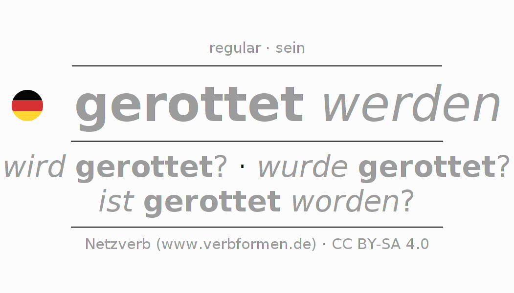 - Future: werde ich gerottet werden?, wirst du gerottet werden?, wird er gerottet werden?, werden wir gerottet werden?, werdet ihr gerottet werden?, werden sie gerottet werden?