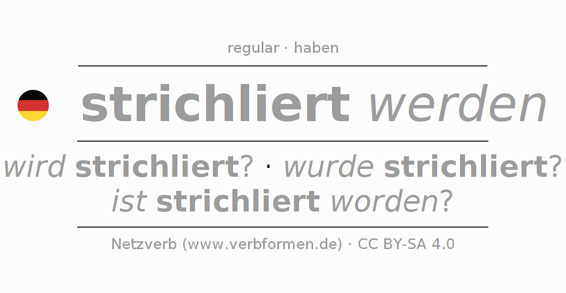 - Present: werde ich strichliert?, wirst du strichliert?, wird er strichliert?, werden wir strichliert?, werdet ihr strichliert?, werden sie strichliert?