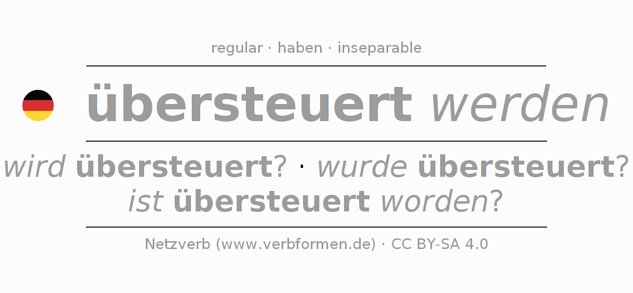 - Future Perfect: werde ich übersteuert worden sein?, werdest du übersteuert worden sein?, werde er übersteuert worden sein?, werden wir übersteuert worden sein?, werdet ihr übersteuert worden sein?, werden sie übersteuert worden sein?