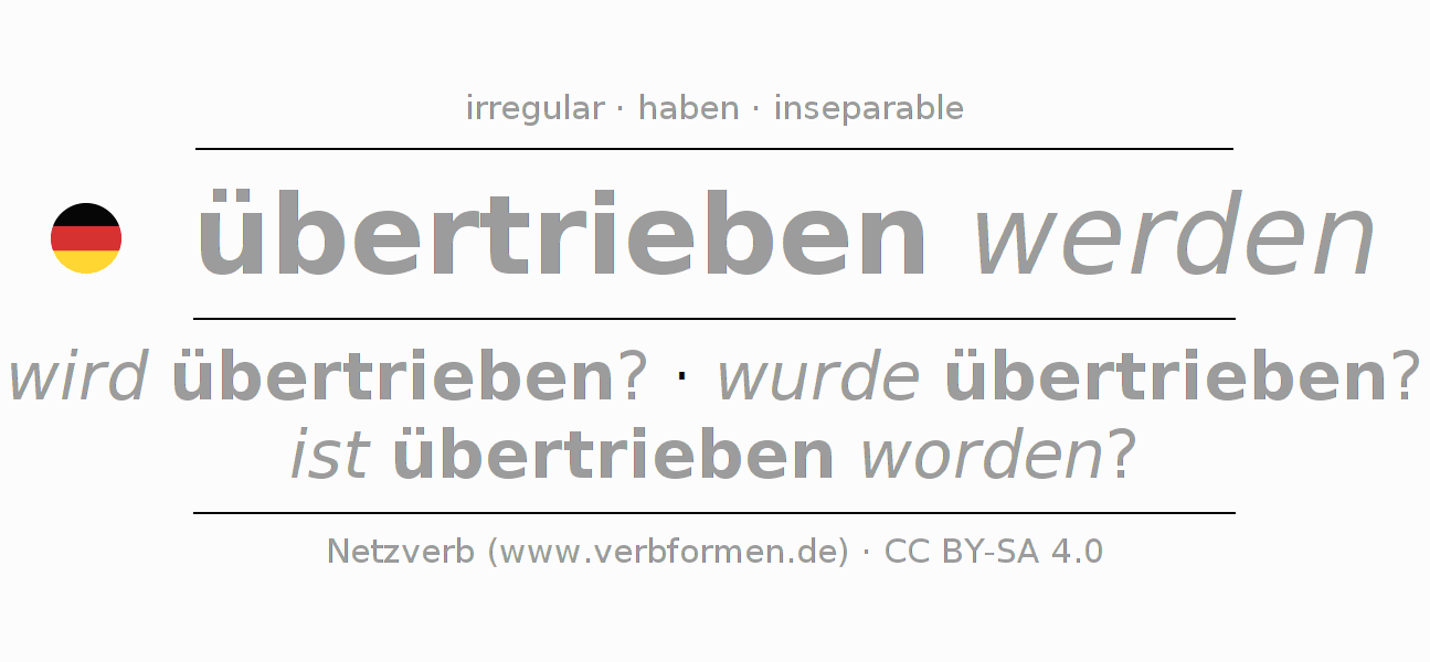 The conjugation of the verb übertreiben (exaggerate, overdo) is irregular. Basic forms are wird übertrieben?, wurde übertrieben? and ist übertrieben worden?. The stem vowels are ei - ie - ie. The auxiliary verb of übertreiben is haben. Prefix über- of übertreiben is not separable. The flection is in Passive and the use as Interrogative. For a better understanding, countless examples of the verb übertreiben are available. For practicing and consolidating, there are also free worksheets for übertreiben. You can not just übertreiben conjugate, but all German verbs. The verb is part of the thesaurus of Zertifikat Deutsch respectivly Level B1. Comments ☆