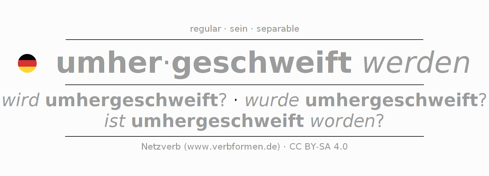 - Future: werde ich umhergeschweift werden?, wirst du umhergeschweift werden?, wird er umhergeschweift werden?, werden wir umhergeschweift werden?, werdet ihr umhergeschweift werden?, werden sie umhergeschweift werden?