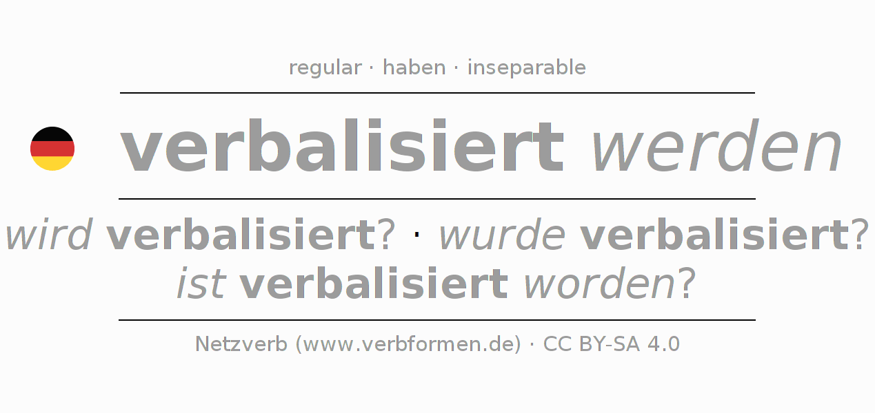 - Future: werde ich verbalisiert werden?, wirst du verbalisiert werden?, wird er verbalisiert werden?, werden wir verbalisiert werden?, werdet ihr verbalisiert werden?, werden sie verbalisiert werden?