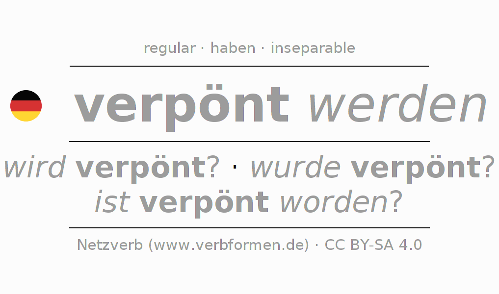 - Future Perfect: werde ich verpönt worden sein?, wirst du verpönt worden sein?, wird er verpönt worden sein?, werden wir verpönt worden sein?, werdet ihr verpönt worden sein?, werden sie verpönt worden sein?