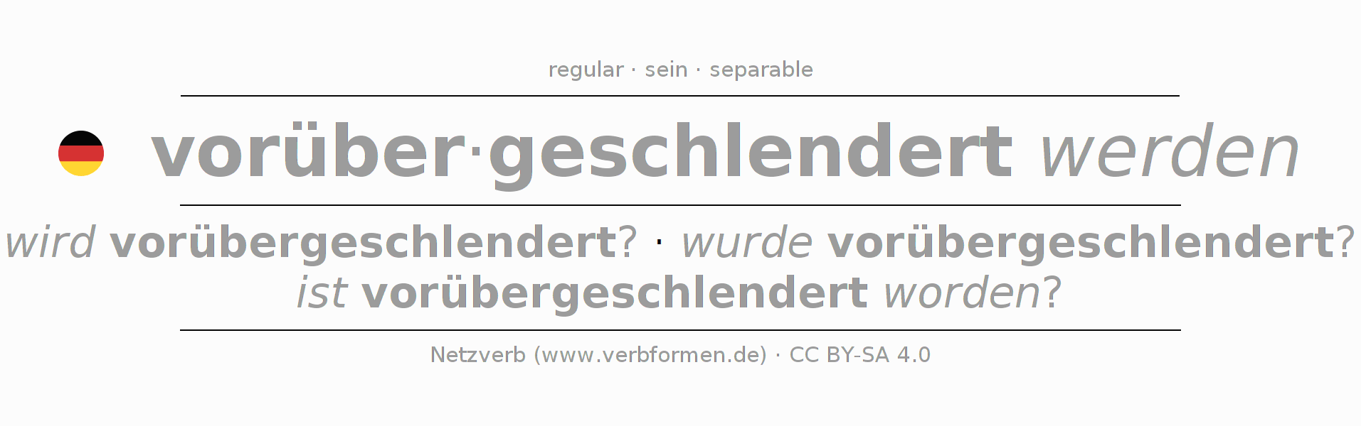 - Future: werde ich vorübergeschlendert werden?, wirst du vorübergeschlendert werden?, wird er vorübergeschlendert werden?, werden wir vorübergeschlendert werden?, werdet ihr vorübergeschlendert werden?, werden sie vorübergeschlendert werden?