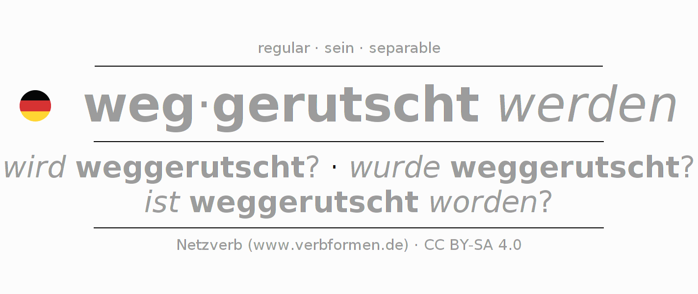 Clear online presentation of the verb 'weg·gerutscht werden' including all verb forms. Therfore, the flection of the verb weg·gerutscht werden can be useful for homework, tests, exams, German lessons in school, learning German, during studies and adult education. Especially for people learning German it is essential to know the correct flection of a verb (wird weggerutscht? - wurde weggerutscht? - ist weggerutscht worden?).