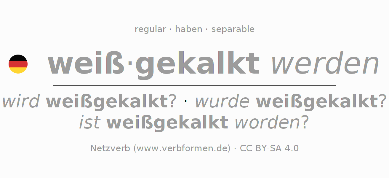 The conjugation of the verb weißkalken (whitewash) is regular. Basic forms are wird weißgekalkt?, wurde weißgekalkt? and ist weißgekalkt worden?. The auxiliary verb of weißkalken is haben. First syllable weiß- of weißkalken is separable. The flection is in Passive and the use as Interrogative. For a better understanding, countless examples of the verb weißkalken are available. For practicing and consolidating, there are also free worksheets for weißkalken. You can not just weißkalken conjugate, but all German verbs. Comments ☆