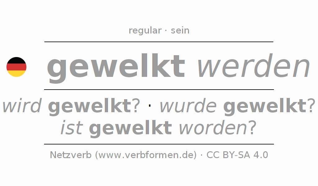 - Future: werde ich gewelkt werden?, werdest du gewelkt werden?, werde er gewelkt werden?, werden wir gewelkt werden?, werdet ihr gewelkt werden?, werden sie gewelkt werden?
