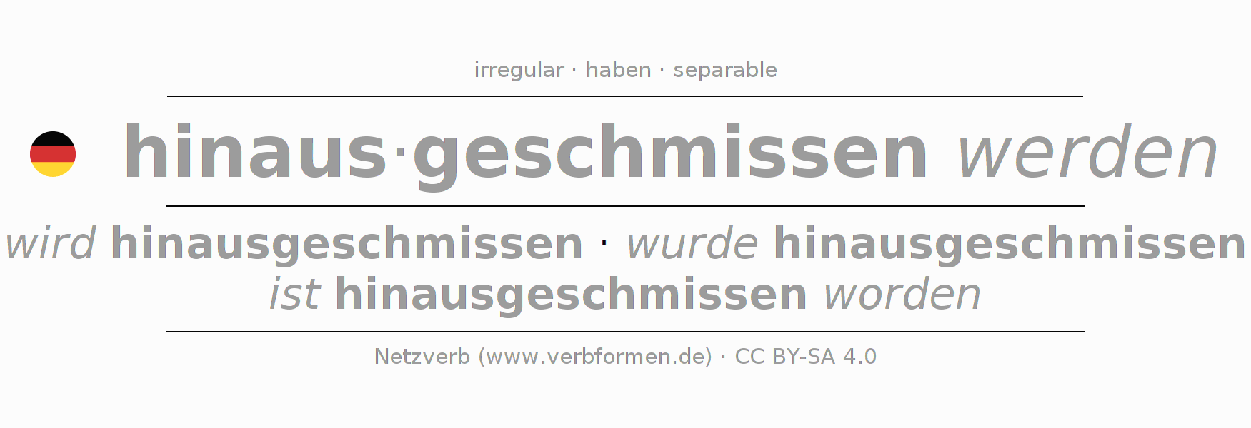 | wir | werden hinausgeschmissen | wurden hinausgeschmissen | werden hinausgeschmissen | würden hinausgeschmissen | - |